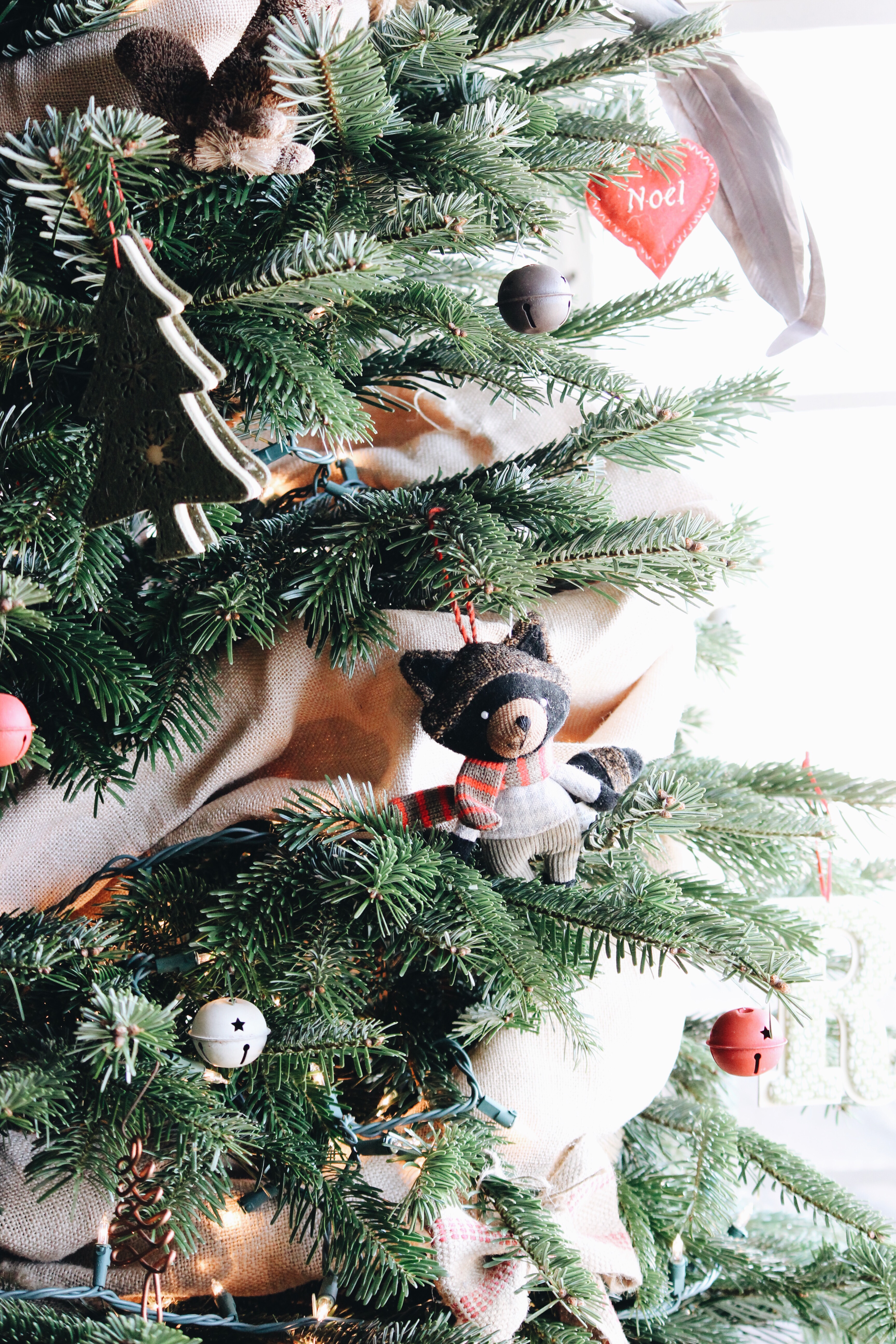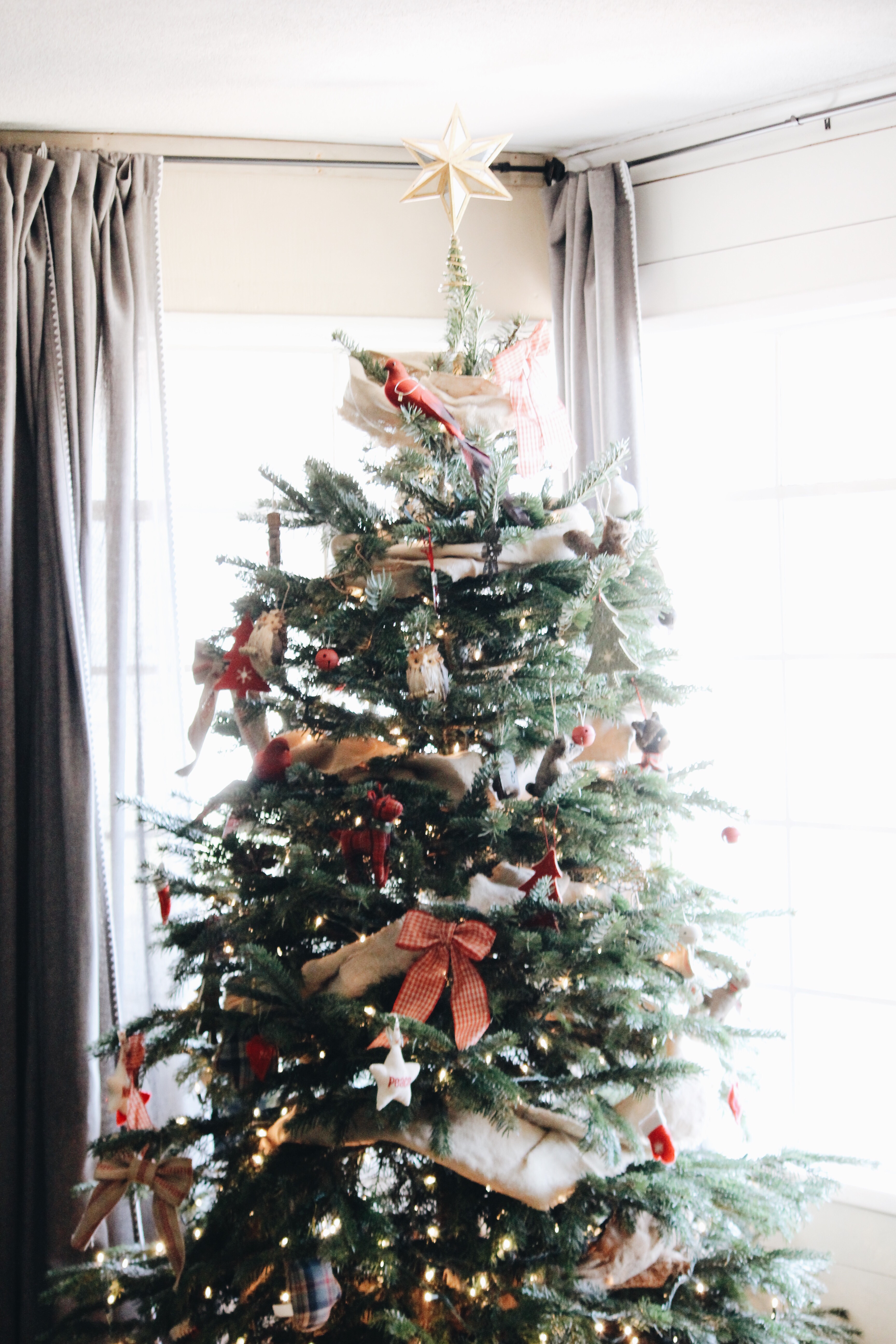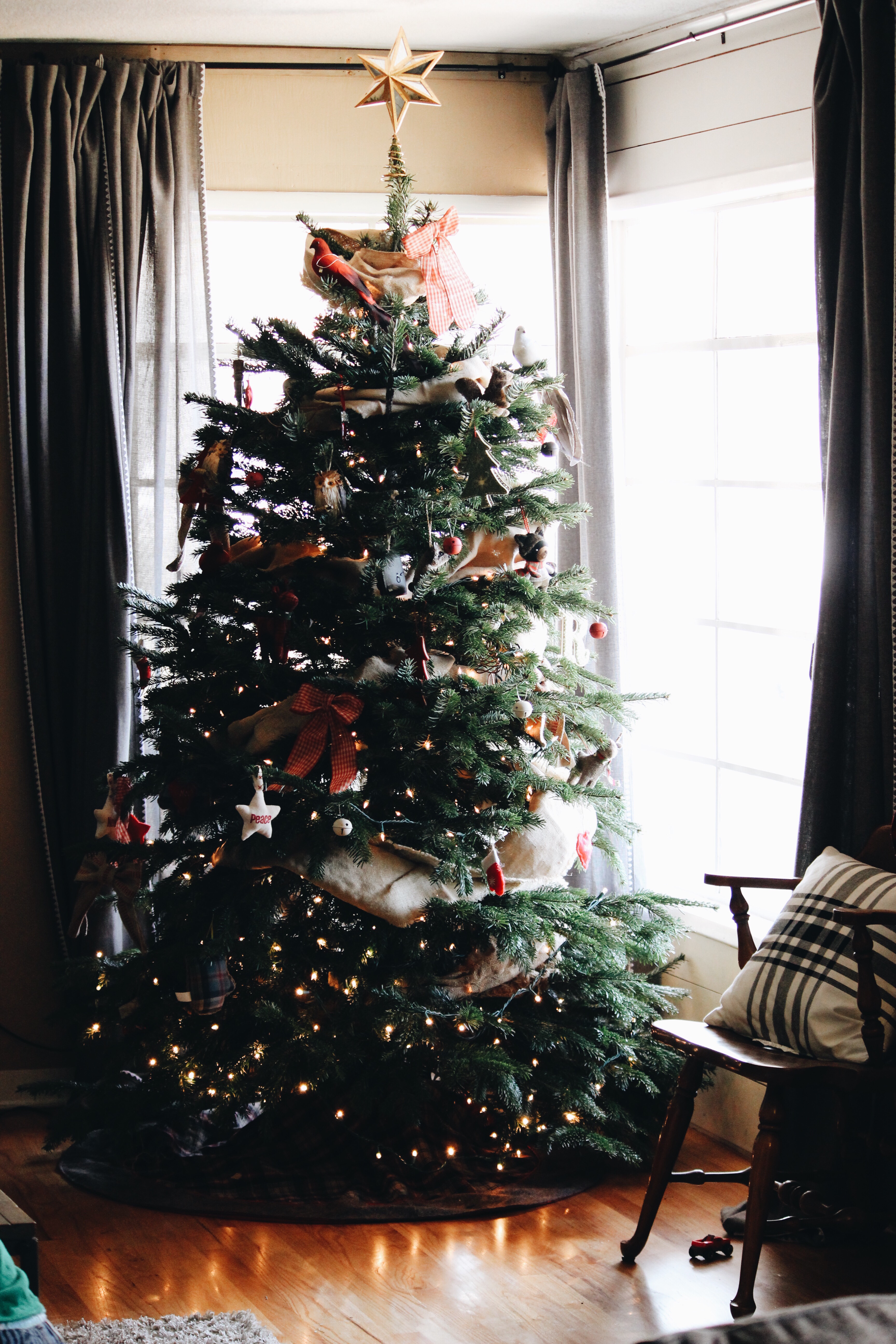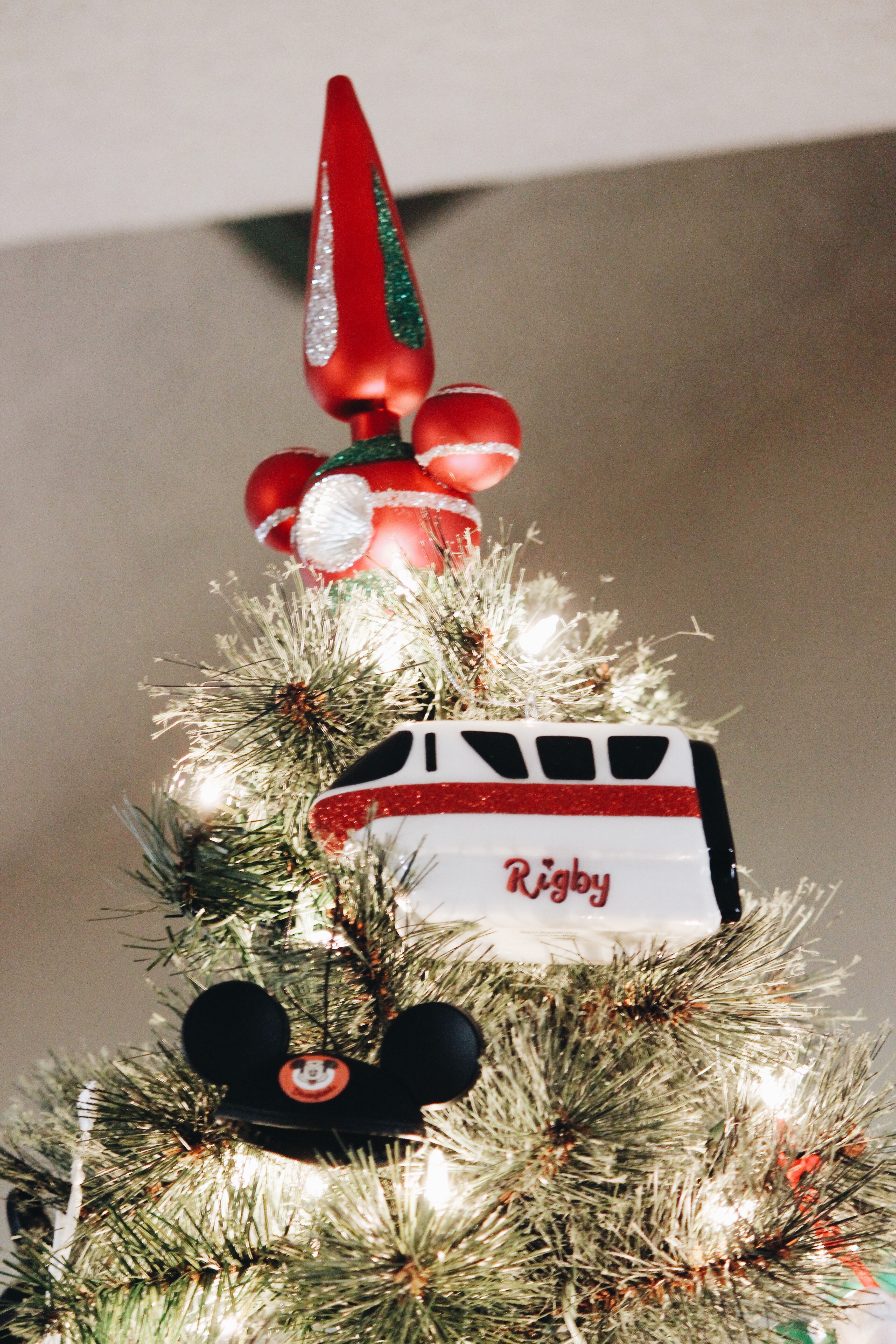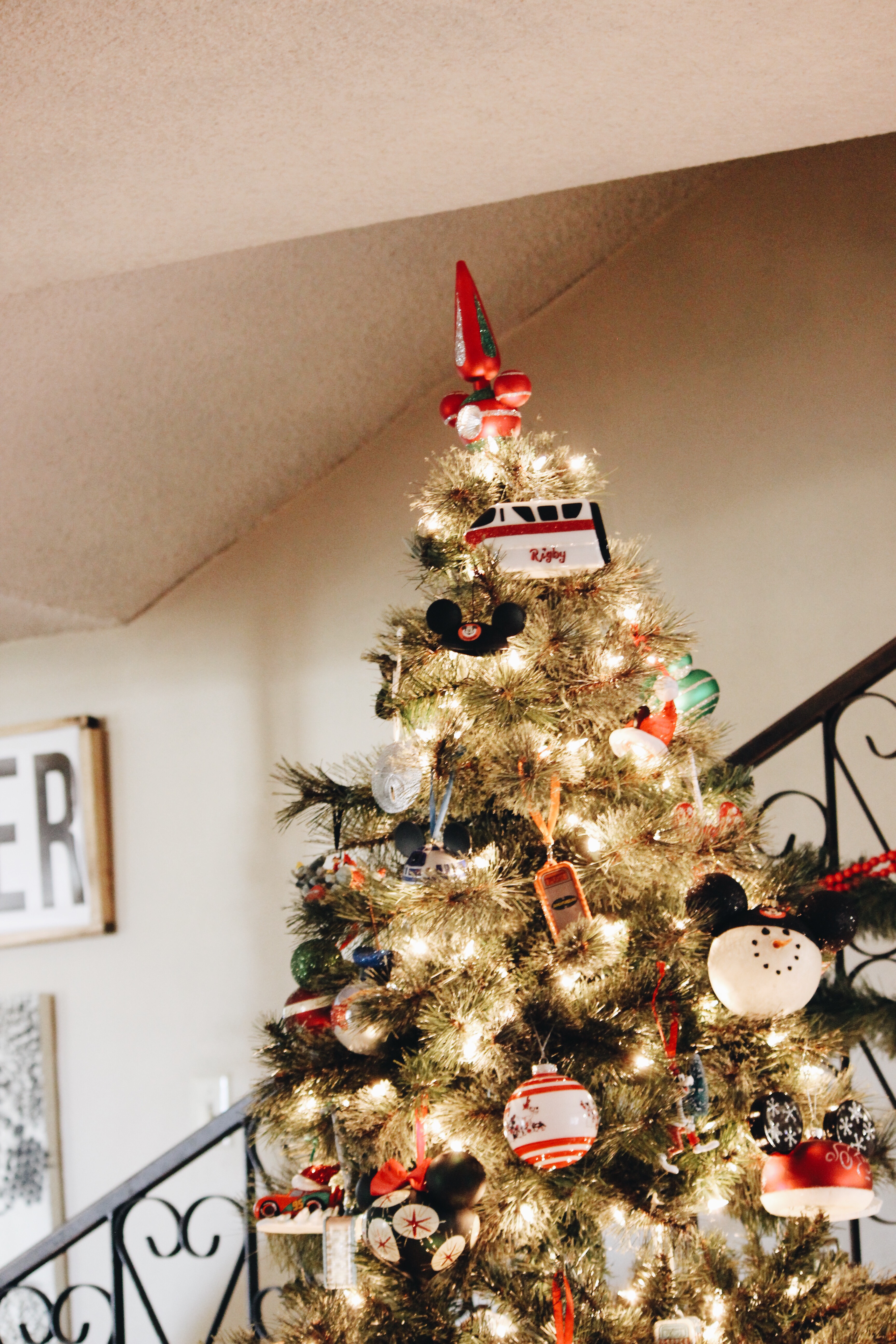 Anyways, we have gotten an ornament every year to commemorate our trip as a family. We have also accumulated a lot of other ornaments that we have collected over the years, needless to say, our Disney ornaments need their own tree( notice how I only decorated the top of the tree🙈). So we have a tree down in the playroom and we have our real tree up in the living room in our corner window.