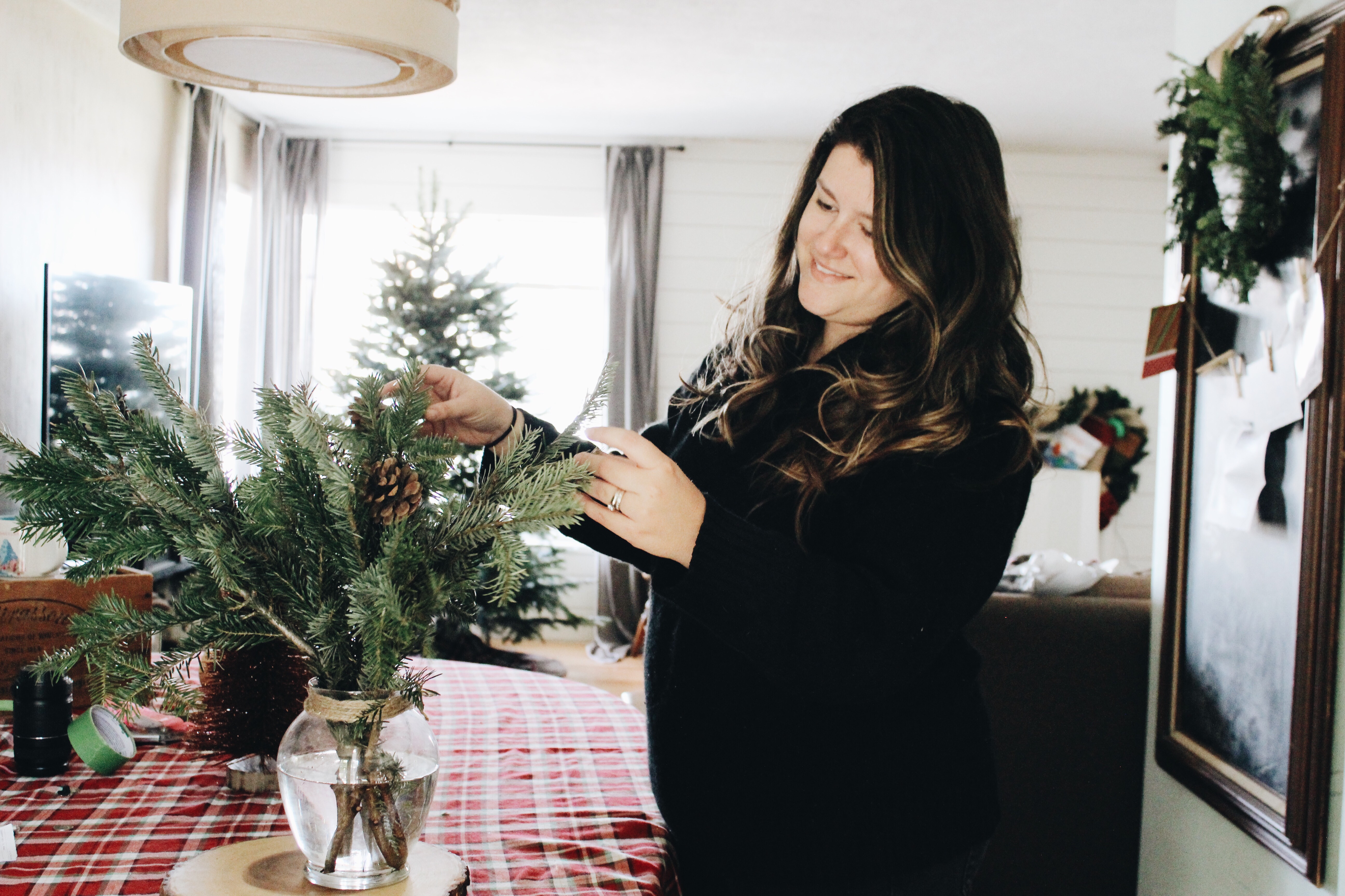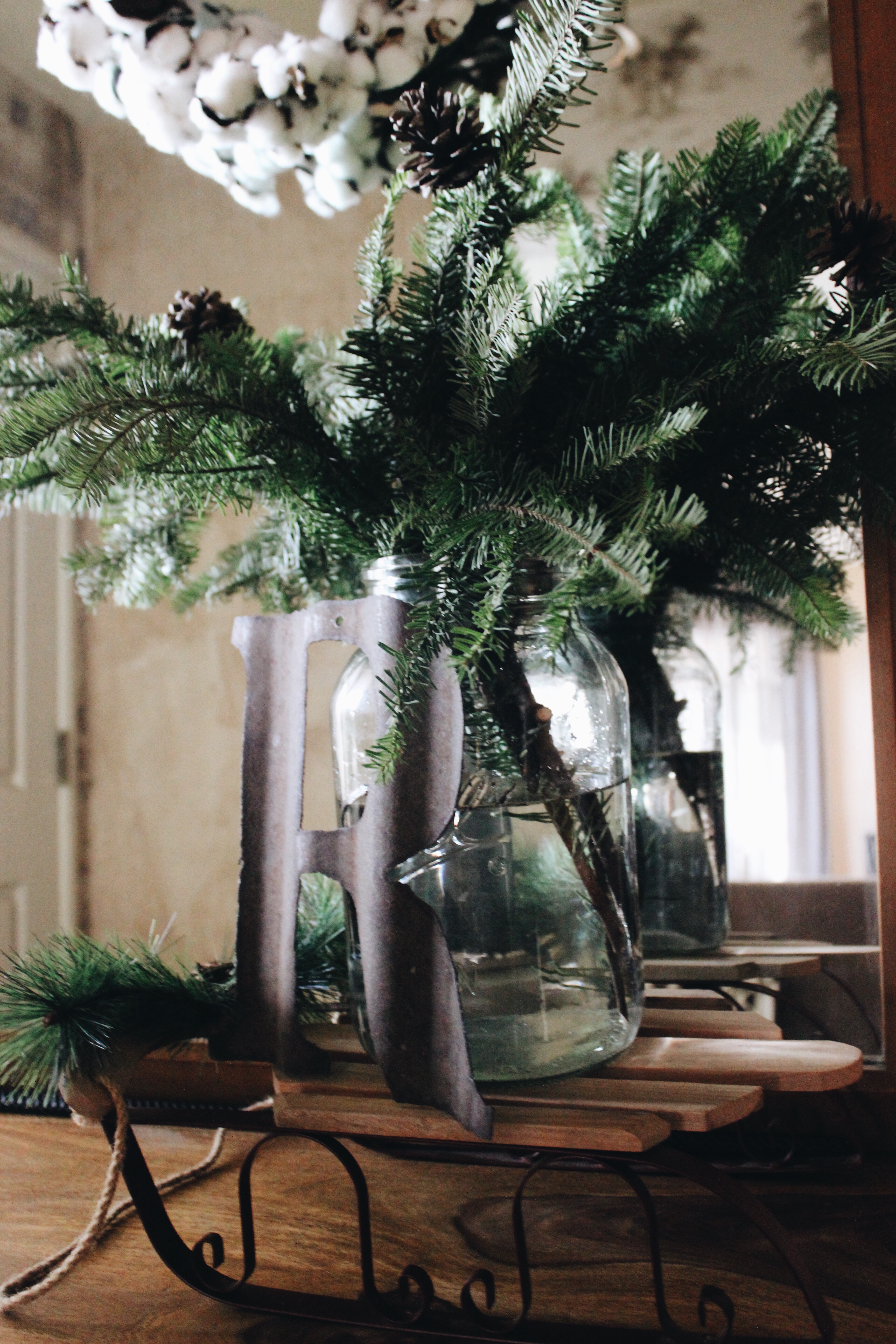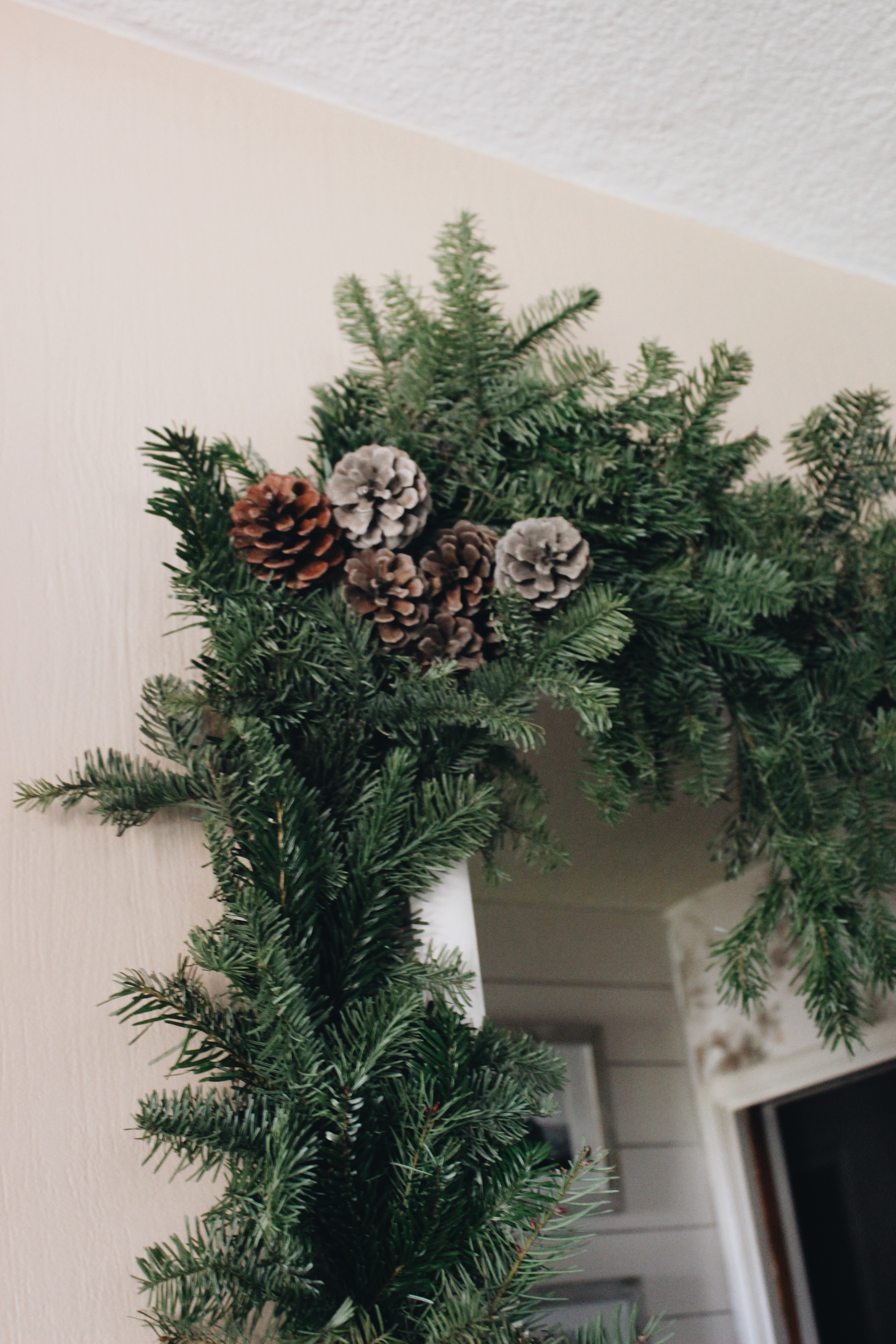 To try and still be Christmasy this year, I opted to add more greenery to our home to not only make it look great, but it also makes it smell amazing! And to top it off, it was all free. Just took some time and some floral wire that I had from a previous project, and voila. Beautiful green winter wonderland!